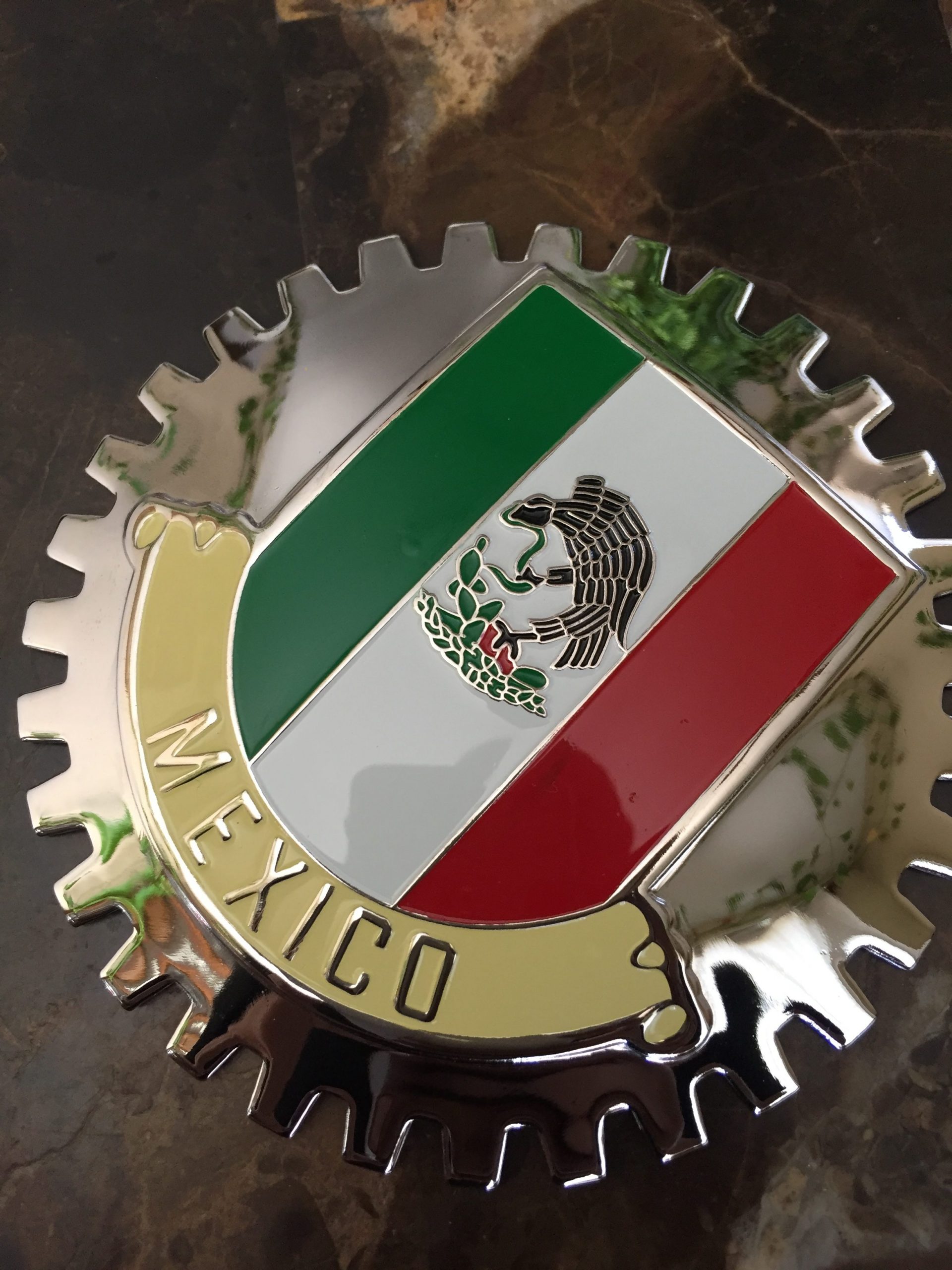 Web 1- NEW Chrome Front Grill Badge Mexican Flag Spanish MEXICO MEDALLION.
